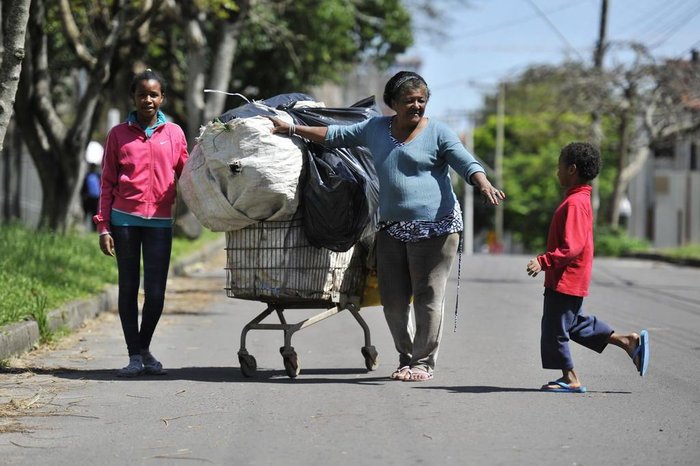 Ao lado dos netos Ruan, sete anos, e Thamires, 15 anos, pretendia recolher mais papelão e garrafas pet antes de voltar para casa. O carrinho cheio poderia lhe garantir até R$ 40 naquele dia.
