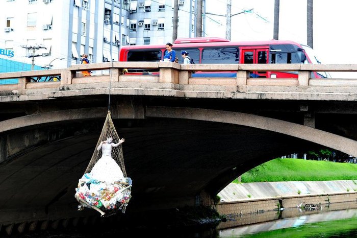 Uma intervenção cultural na ponte da Avenida João Pessoa, em Porto Alegre, chama a atenção na manhã desta sexta-feira. Artistas do projeto Ecopoética estão pendurados dentro de uma rede repleta de lixo sobre o Arroio Dilúvio. Eles devem permanecer no local até as 13h30min.