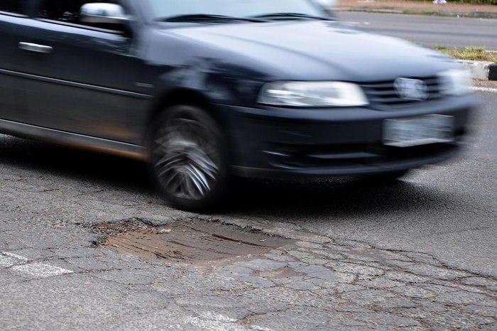 De longe, a cavidade até não assusta. No entanto, quando a roda cai no buraco, o barulho chama a atenção. Quando são veículos mais pesados, então, o estrondo é grande. Ali, o asfalto apresenta rachaduras. No acostamento, na altura do buraco, e no canteiro central, há quatro calotas inteiras e um pedaço de uma outra, que não resistiram ao impacto.