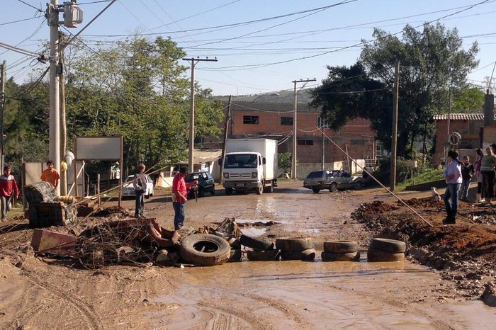 Em protesto à obra na Estrada Afonso Lourenço Mariante, que está parada na Lomba do Pinheiro há alguns dias, moradores da região trancaram a passagem de carros com pneus e galhos de árvore.