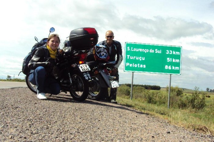 A duplal ainda pegou enchente em Jaguarão, a 390km da Capital. Mas Baixinha conta que o ar puro subindo pelo capacete a fazia "esquecer dos problemas".