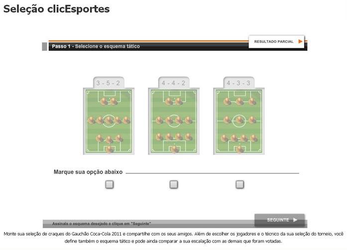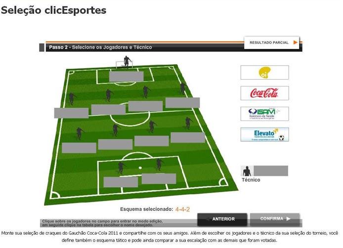 O Gauchão 2011 começou neste final de semana, e os internautas do clicEsportes já estão convocados a escalarem a seleção dos melhores jogadores do Estadual. Basta acessar este endereço e você poderá montar uma equipe no esquema tático de sua preferência, com todos os jogadores e treinadores do certame à sua disposição.