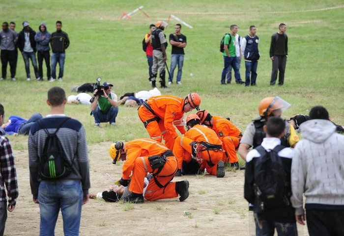 Correria, briga de torcidas, sirenes e resgate por helicóptero. O aparente deus nos acuda nos arredores do Anfiteatro Pôr do Sol, em Porto Alegre, na manhã de sábado, foi uma simulação bem-sucedida de tumulto na Copa do Mundo. Aquela área vai receber a Fan Fest, evento que reunirá milhares de pessoas em junho, com shows e transmissão dos jogos em telões.
